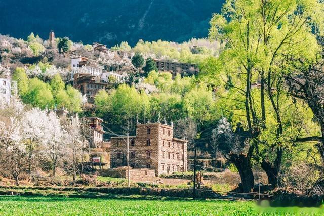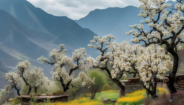 丹巴的春天,是梨花的海洋。万亩梨花盛开,洁白如雪,与藏寨碉楼相映成趣,构成一幅美丽的藏区春景图。